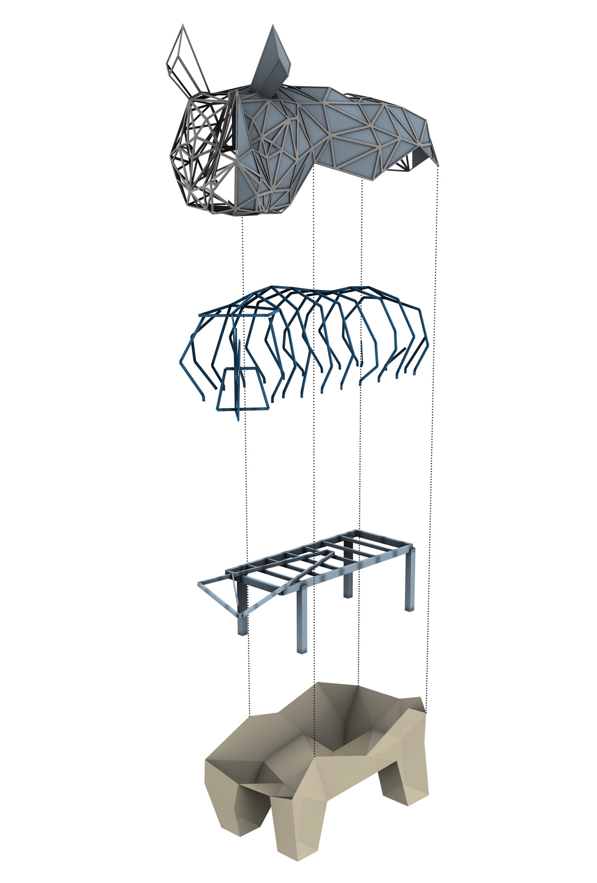 The rhino’s complex geometry and scale created immediate design and fabrication challenges as the system was too large to fabricate in one piece and ship to site. An HSS-steel platform moment frame forms the primary structural system that transfers loads to the foundation while supporting the colorful climbing surfaces on the legs and belly developed in coordination with Eldorado Climbing Walls. Above the platform, an HSS rib frame provides the scaffold for the rhino’s skin surface.