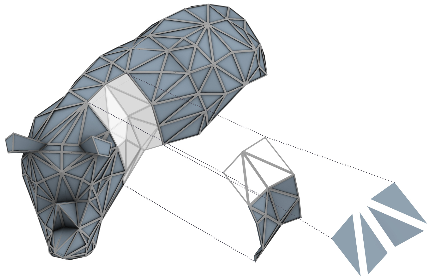 Special components such as the ears and horn deviated from the facet frame truss system and required unique detailing considerations. While the facet frame alone could not support these large protrusions, it was integrated with the HSS rib frame to provide sufficient support without inducing concentrated moments into the thin skin truss. Installation also required access to the rhino’s internal cavity, making bolt access a pivotal element of the detailing process.