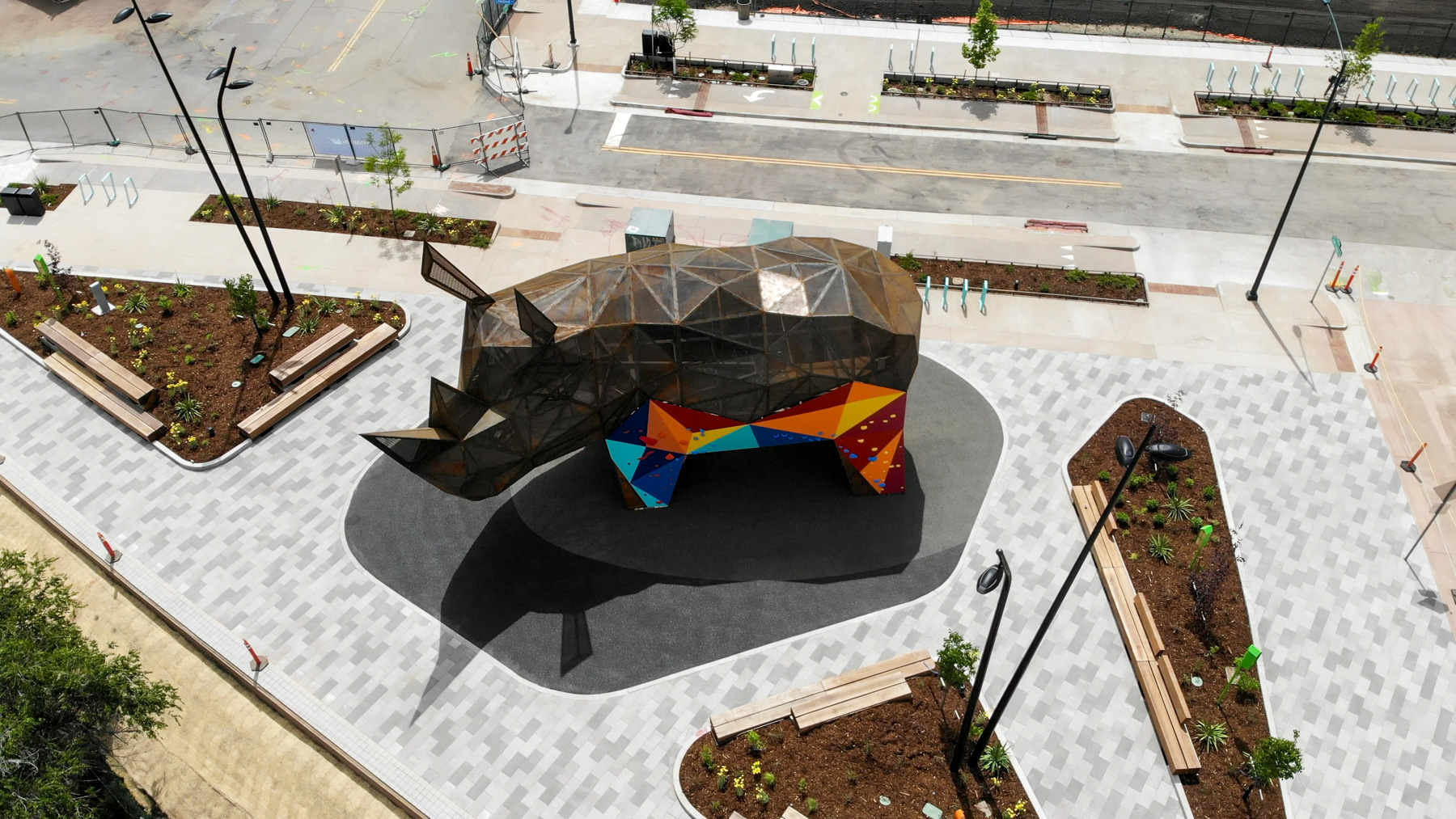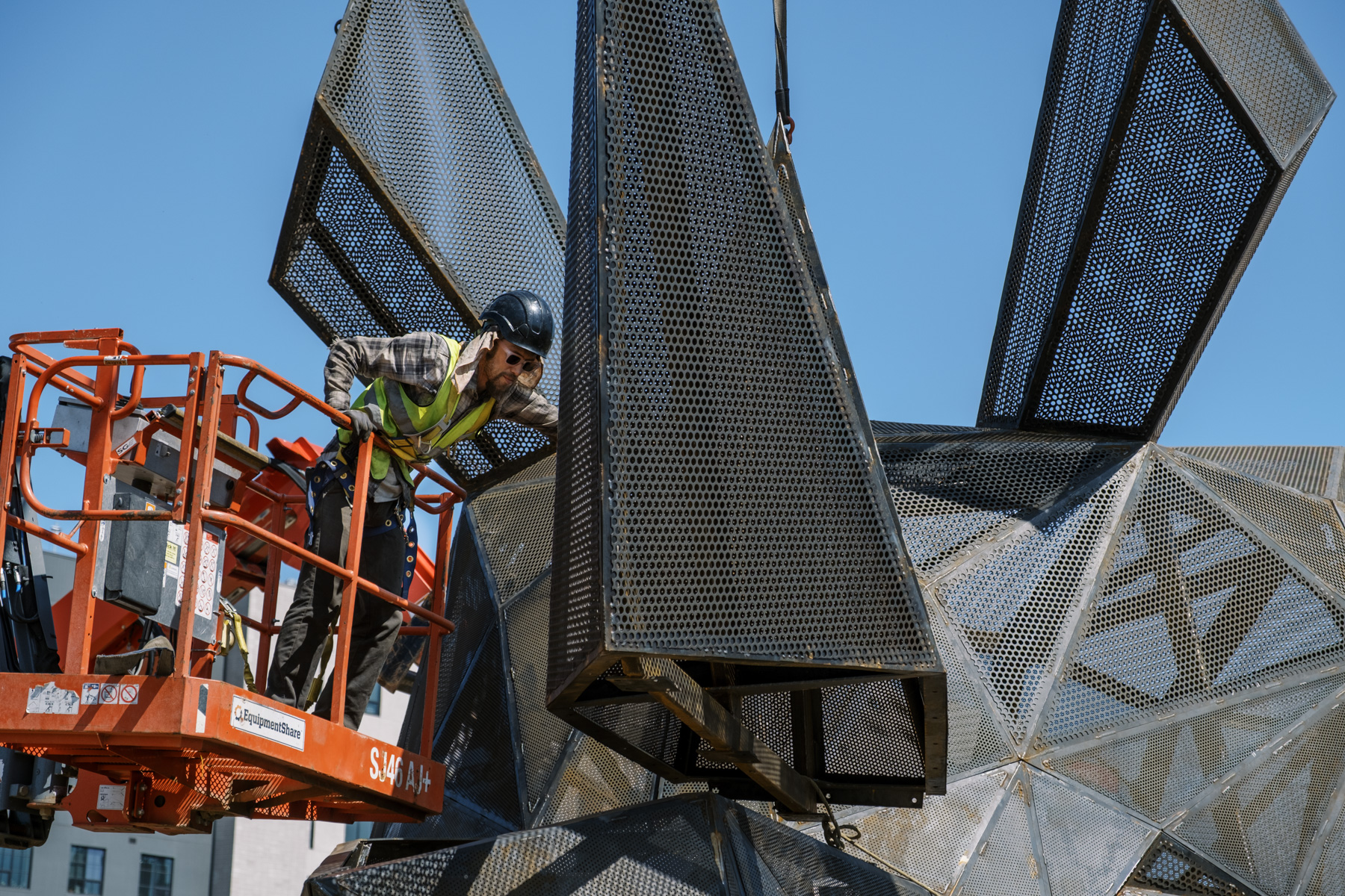 When Denver-based developers Golub Capital and Formativ and architect Sasaki Design began planning their South Platte River revitalization north of the Colorado Rockies Ballpark, they envisioned an interactive play structure to rival Blucifer, the cast-fiberglass mustang at Denver International Airport. The River North Arts District (RiNo), never hesitant to lean into its namesake, inspired the idea of a giant rhinoceros climbing structure. The developers sought a local team for design, fabrication, and installation. JunoWorks, the fabricator of the district’s iconic Corten steel signs featuring rhinos and birds, was the natural choice.