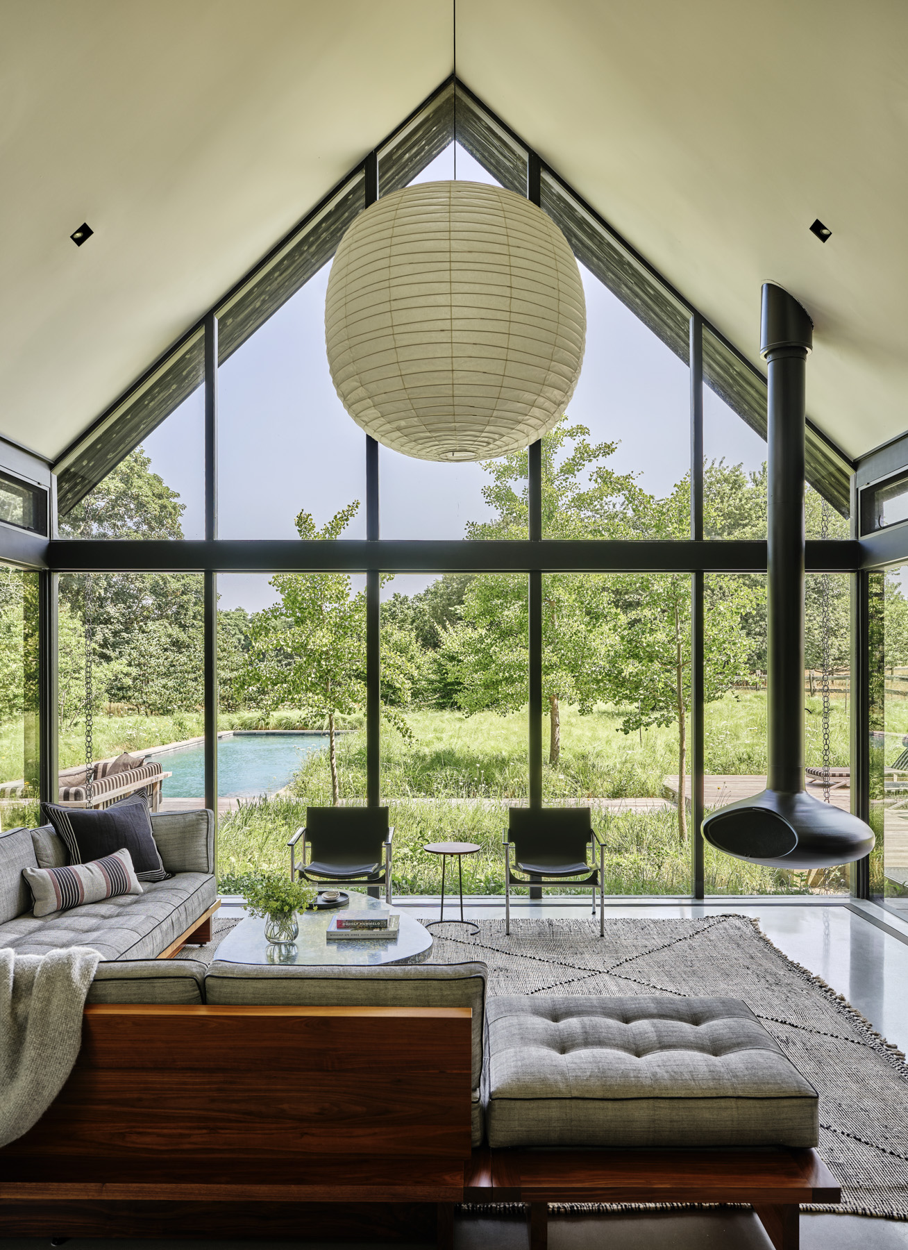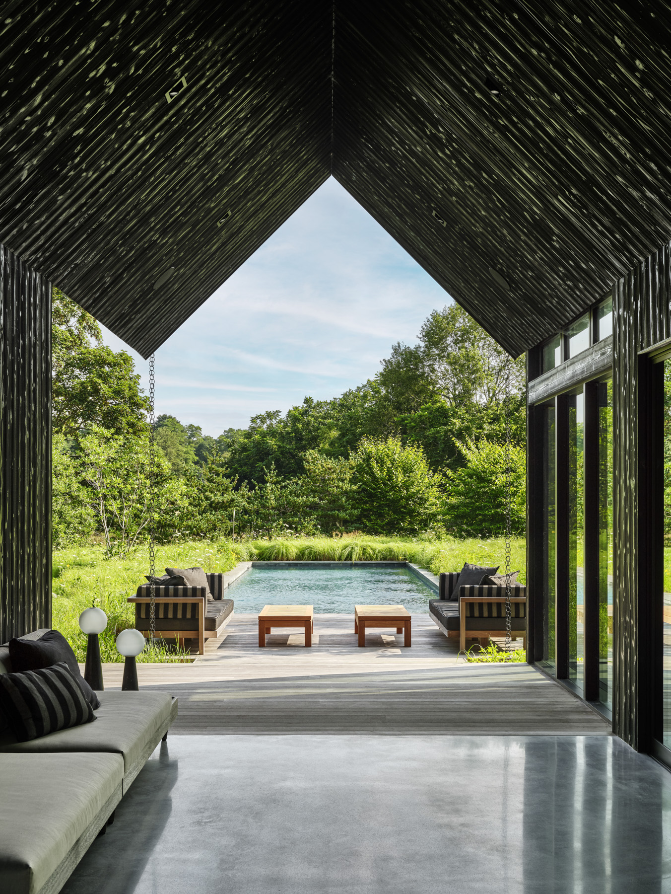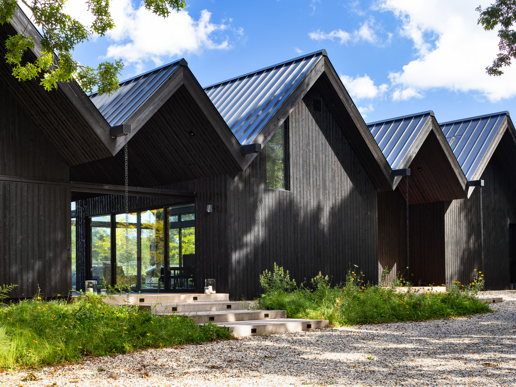 This residence with architect Workshop/APD is defined by a striking series of gabled forms, unified under a bold folded-plate roof system. From the exterior, the sharp ridges and deep overhangs read as a rhythm of blackened wood pavilions set within a natural landscape. Behind this architectural expression lies a carefully engineered structural system designed to provide openness and continuity across the home.