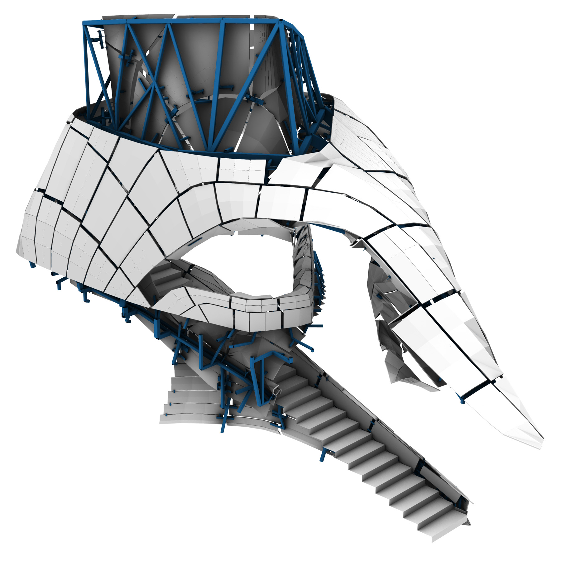 At the core of the design is a series of dry-cast concrete panels, each uniquely shaped and precisely fabricated to align with the museum’s organic surfaces. Rather than relying on continuous framing, each panel was supported at its corners by a concealed steel framework. This approach minimized the visual presence of structure, while providing the precision needed to maintain the flowing geometry. The challenge was not only in defining how the panels were supported individually, but also in ensuring that the entire system behaved as one, settling into its final form under the weight of the concrete and the loads it would carry over time.