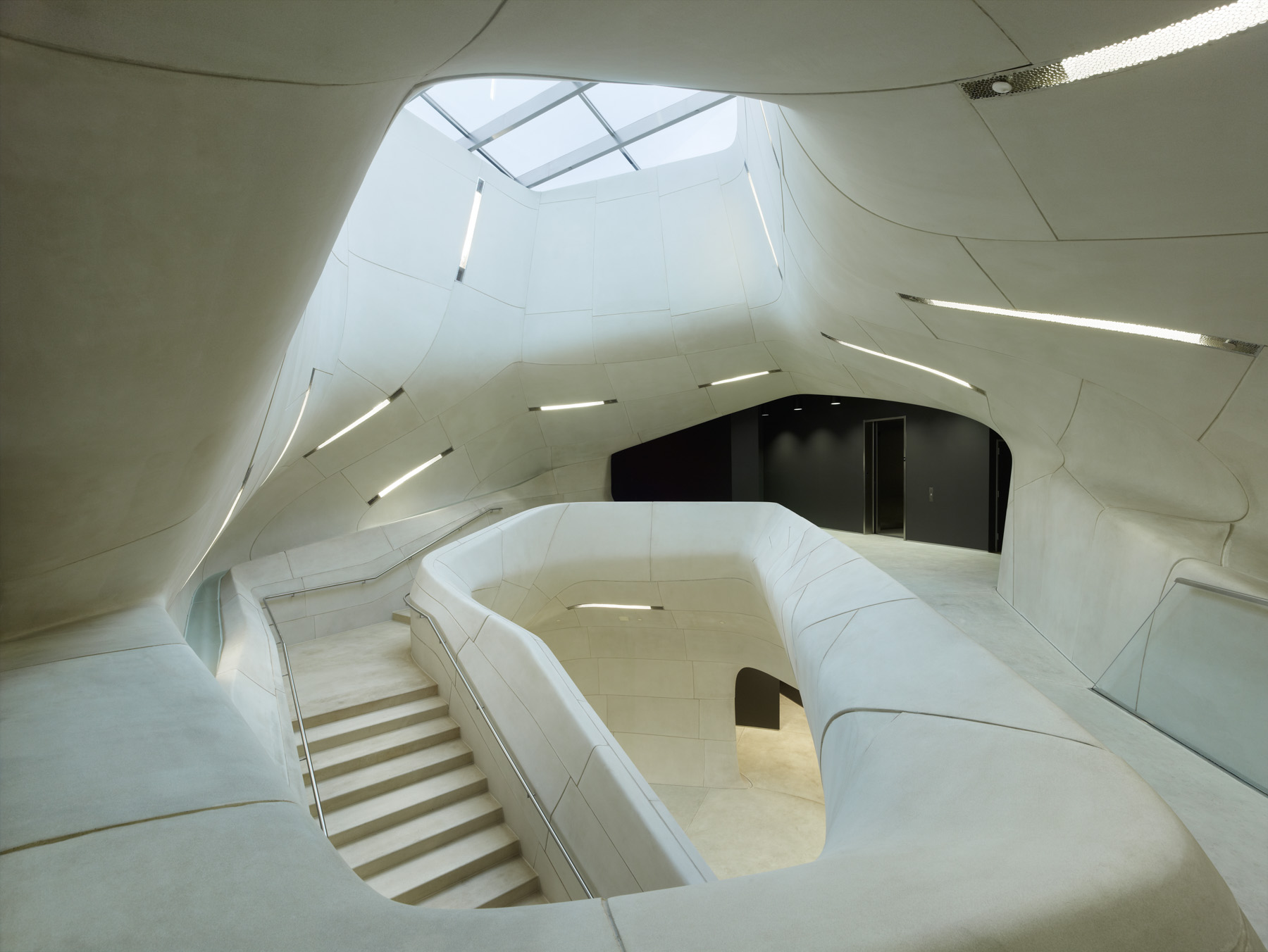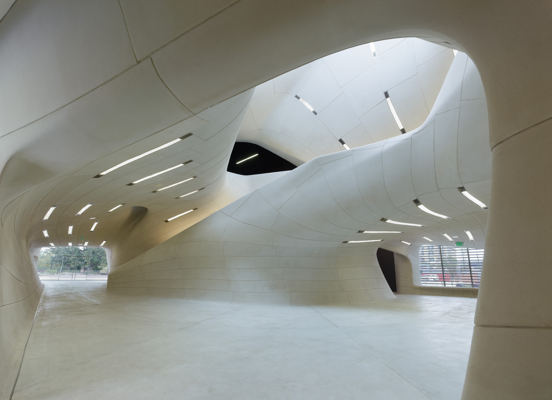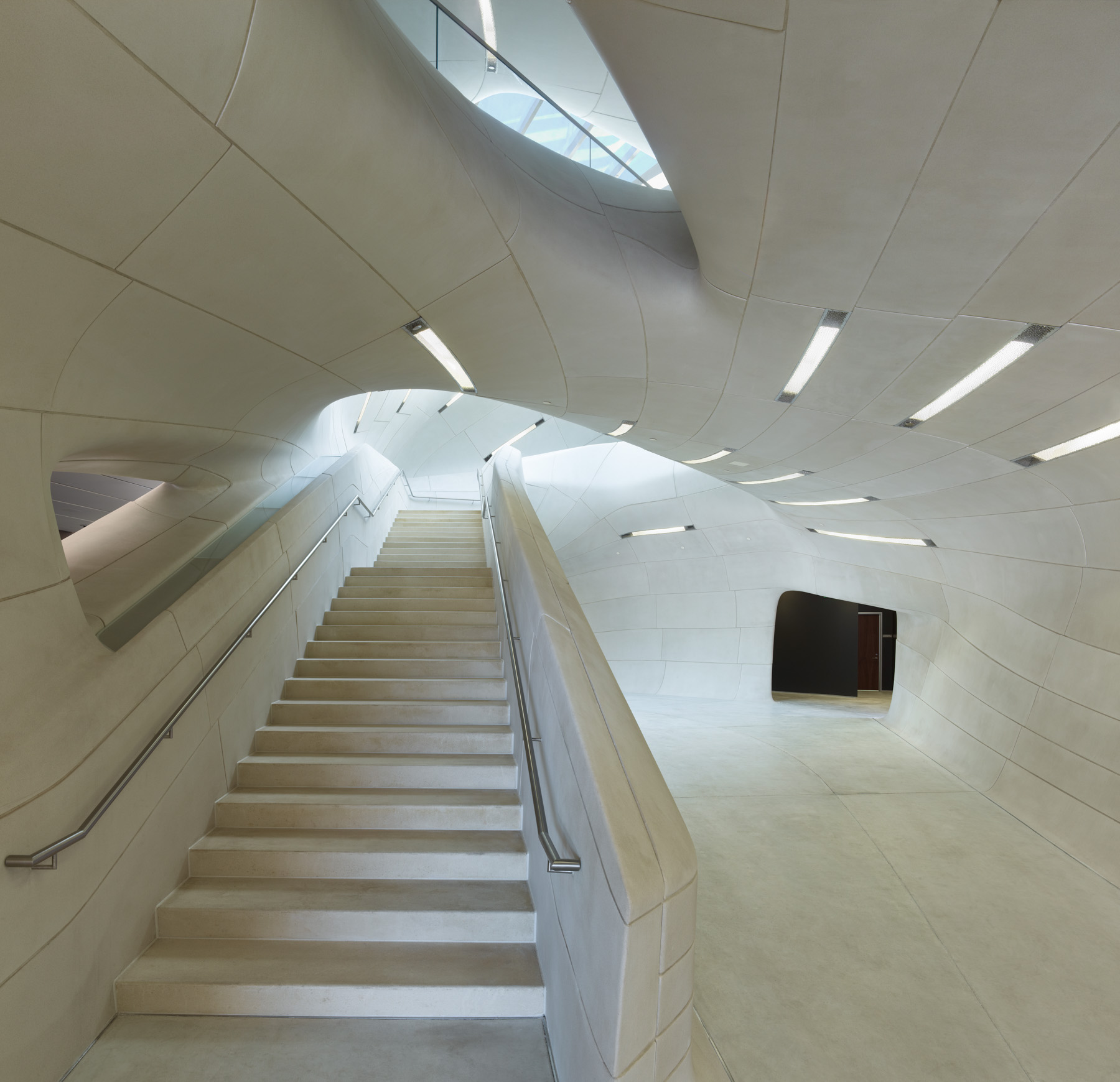 The result of this effort is an interior where structure disappears into form. The concrete panels are continuous across walls and ceilings, curving to frame circulation paths and allow natural light from above. Visitors experience the architecture as a cave-like environment, unaware of the precise steel skeleton that holds each surface in place. The absence of visible structure allows the museum’s materiality and light to take center stage, creating an environment both monumental and intimate.